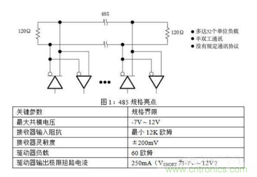 2.1.2單位負(fù)載概念掛接在同一485通訊總線上的驅(qū)動(dòng)器和接收器,其最大數(shù)量取決于它們的負(fù)載特性。驅(qū)動(dòng)器和接收器的負(fù)載都是相對(duì)單位負(fù)載而衡量的。485標(biāo)準(zhǔn)規(guī)定一根傳輸總線上最多可以掛接32個(gè)單位負(fù)載。單位負(fù)載定義為:在12V共模電壓環(huán)境中,允許通過(guò)穩(wěn)態(tài)負(fù)載1mA電流,或者是在-7V共模電壓環(huán)境中,允許通過(guò)穩(wěn)態(tài)負(fù)載0.8mA電流。單位負(fù)載可能由驅(qū)動(dòng)器、接收器和失效保護(hù)電阻組成,但不包括AC終端匹配電阻。