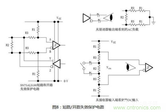 在這些電路中,R2代表傳輸線阻抗匹配電阻,并成為電壓驅(qū)動(dòng)器的一部分:產(chǎn)生穩(wěn)態(tài)偏置電壓。這里假設(shè)每個(gè)接收器代表1個(gè)單位負(fù)載。圖7右半部分的表格中列出了一些典型電阻和電容值、提供的失效保護(hù)類型、使用的單位負(fù)載個(gè)數(shù)和信號(hào)失真。在下一節(jié)中,會(huì)通過(guò)對(duì)短路失效電路中的電阻值計(jì)算,來(lái)說(shuō)明如何修改這些電阻值以便適用于特定設(shè)計(jì)。