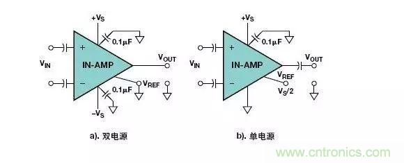 類似的問(wèn)題也會(huì)出現(xiàn)在儀表放大器電路中。圖3示出了使用兩只電容器進(jìn)行AC耦合的儀表放大器電路,沒(méi)有提供輸入偏置電流的返回路徑。這個(gè)問(wèn)題在使用雙電源(圖3a)和單電源(圖3b)供電的儀表放大器電路中很常見(jiàn)。