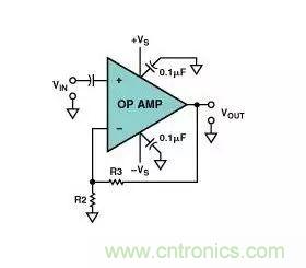 圖12.單電源同相輸入放大器電路正確的電源退耦方案。中頻增益=1+R2/R1