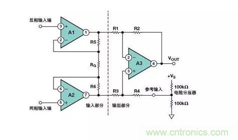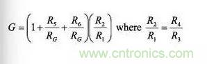 例如,流行的儀表放大器設(shè)計(jì)配置使用上圖所示的三運(yùn)放結(jié)構(gòu)。其信號(hào)總增益為