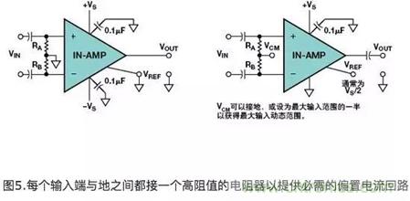 這兩只電阻器為輸入偏置電流提供了一個(gè)放電回路。在圖5所示的雙電源例子中,兩個(gè)輸入端的參考端都接地。在圖5b所示的單電源例子中,兩個(gè)輸入端的參考端或者接地(VCM接地)或者接一個(gè)偏置電壓,通常為最大輸入電壓的一半。