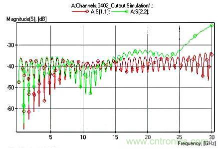 圖7圖8對(duì)比,在用ROGERS板材做隔層處理之后,相比未做隔層處理回波損耗下降到-30dB之內(nèi),大大降低了回波損耗,保證了信號(hào)傳輸?shù)耐暾?/div>