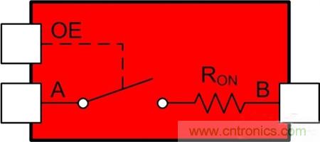 通過輸出使能引腳 (OE),用電壓來控制這個(gè)開關(guān);只需在高電平關(guān)閉開關(guān),在低電平時(shí)打開開關(guān)。(對于低電平有效OE引腳來說,恰恰相反;這些引腳上通常會(huì)有標(biāo)簽進(jìn)行標(biāo)注。)RON 是開關(guān)的內(nèi)部電阻。A和B到開關(guān)的兩個(gè)連接點(diǎn)。