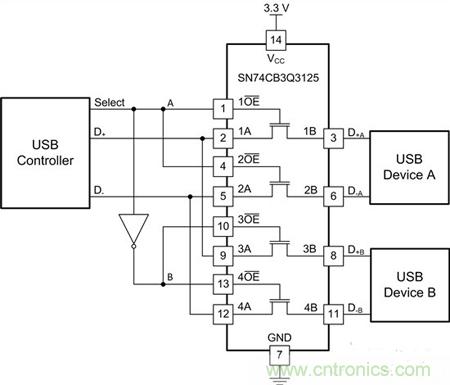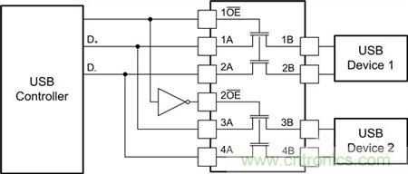 圖4:將2個(gè)USB器件復(fù)用至一個(gè)控制器時(shí)的SN74CB3Q3125接線