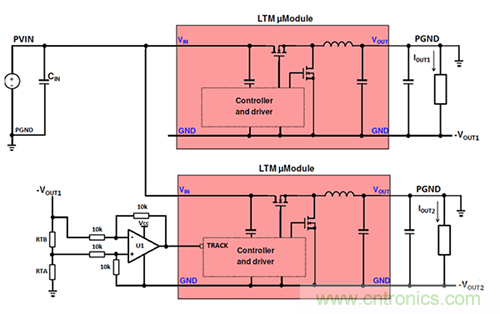 TRACK引腳輸入允許μModule穩(wěn)壓器通過將跟蹤信號(即,主μModule穩(wěn)壓器的輸出電壓軌的分壓版本)提供給從μModule穩(wěn)壓器的TRACK引腳來跟蹤另一電源軌的輸出電壓斜坡。每個μModule穩(wěn)壓器內(nèi)部控制器所看到的TRACK引腳電壓與其μModuleGND引腳相關(guān),但在需要配置兩個負(fù)輸出轉(zhuǎn)換器進(jìn)行跟蹤的應(yīng)用中,μModule穩(wěn)壓器的GND引腳可以處于不同的電位。主和從GND引腳電位差異意味著主設(shè)備提供的跟蹤信號不能直接施加到從設(shè)備的跟蹤引腳。在這些類型的應(yīng)用中,需要額外的考慮以確保從機(jī)相位能夠看到來自主機(jī)相位的正確參考的跟蹤信號。