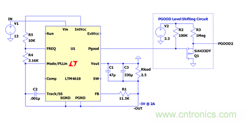 下面舉例說明在負(fù)輸出配置中使用LTM4618時PGOOD引腳電平轉(zhuǎn)換電路的設(shè)置。V IN = 12V,-V OUT = -5V @ 3A。
