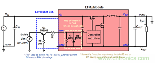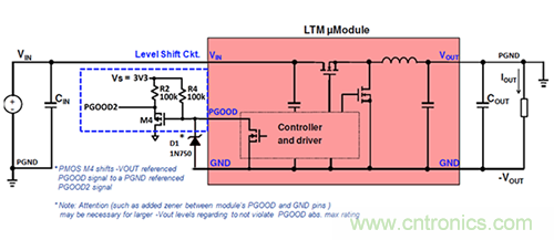 圖2.μModule穩(wěn)壓器的輸入信號必須從電源地電平轉(zhuǎn)換為-VOUT參考電平