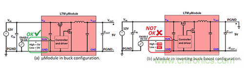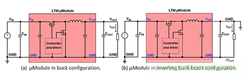圖1.僅僅幾個連接變化將一個降壓μModule穩(wěn)壓器(a)轉(zhuǎn)換為一個負(fù)輸出穩(wěn)壓器(b)