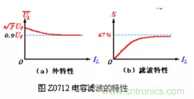 4. 電容濾波電路的外特性(指UL與IL之間的關(guān)系)和脈動(dòng)特性(指S與IL 之間的關(guān)系)比較差,如圖Z0712 所示。可以看出輸出電壓UL和脈動(dòng)系數(shù)S隨著輸出電流IL 的變化而變化。當(dāng)IL=0(即RL= ∞ )時(shí),UL = U2(電容充電到最大值后不再放電),S = 0。當(dāng)IL增大(即RL減?。r(shí),由于電容放電程度加快而使UL下降,UL 的變化范圍在 U2 ~0.9 U2之間(指全波或橋式),S變大。所以,電容濾波一般適用于負(fù)載電流變化不大的場(chǎng)合。
