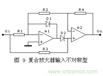 圖7,8,9三種電路,當運放A1輸出為正時,A1的負反饋是通過二極管D2和運放A2構(gòu)成的復合放大器構(gòu)成的,由于兩個運放的復合(乘積)作用,可能環(huán)路的增益太高,容易產(chǎn)生振蕩。