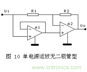 圖10是利用單電源運放的跟隨器的特性設(shè)計的,單電源的跟隨器,當輸入信號大于0時,輸出為跟隨器;當輸入信號小于0的時候,輸出為0.使用時要小心單電源運放在信號很小時的非線性.而且,單電源跟隨器在負信號輸入時也有非線性。