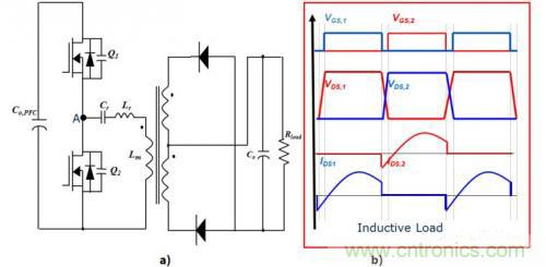 圖a)是典型的LLC串聯(lián)諧振電路。圖b)是感性負(fù)載下MOSFET的工作波形。由于感性負(fù)載下,電流相位上會(huì)超前電壓,因此保證了MOSFET運(yùn)行的ZVS。要保證MOSFET運(yùn)行在感性區(qū),諧振電感上的諧振電流必須足夠大,以確保MOSFET源漏間等效的寄生電容上存儲(chǔ)的電荷可以在死區(qū)時(shí)間內(nèi)被完全釋放干凈。