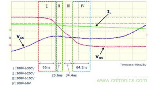 LLC串聯(lián)諧振電路MOSFET的Vds放電過程分為四個(gè)階段,如下圖所示, (I) 380V-300V; (II) 300V-200V; (III) 200V-100V; (IV)100V-0V。