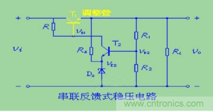 這種穩(wěn)壓電路的主回路由調(diào)整管T與負(fù)載相串聯(lián)構(gòu)成,且T工作在線性狀態(tài),故稱為線性串聯(lián)式穩(wěn)壓電路。