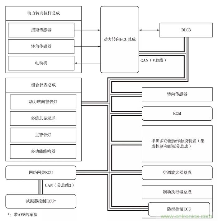 在分析方框圖了解信號(hào)或電流傳輸過程時(shí),應(yīng)認(rèn)真查看圖中的箭頭方向,箭頭方向表示信號(hào)的傳輸方向。如果沒有箭頭方向,則可根據(jù)方框圖的圖形符號(hào)來判斷。箭頭如果是雙向的,表示信號(hào)既能輸入也能輸出;方框圖中粗線條表示CAN總線,下圖所示為2016 款皇冠EPS系統(tǒng)方框圖(系統(tǒng)圖)。對(duì)方框圖有整體的了解后,應(yīng)進(jìn)一步弄清系統(tǒng)(整車或系統(tǒng))共有幾個(gè)框(多少部件),框與框之間存在何種關(guān)系,再對(duì)照電路原理圖,就可以對(duì)電路理解得更為深刻。