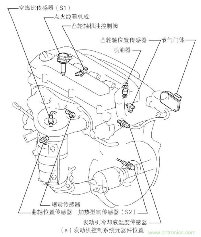 汽車元器件布置圖與汽車線束圖類似,標(biāo)注了電控系統(tǒng)傳感器、執(zhí)行器在汽車上的安裝位置,布置圖和線束圖、電路圖配合使用可以在實(shí)際維修中快速定位傳感器、執(zhí)行器、繼電器、熔絲等的詳細(xì)位置,再配合插腳圖能更加準(zhǔn)確快捷地定位故障元件。下圖為發(fā)動(dòng)機(jī)控制系統(tǒng)元器件位置以及熔絲、繼電器安裝位置。