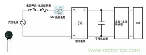 如下圖所示,通過插入NTC熱敏電阻來限制SMPS的勵(lì)磁涌流被廣泛地用作形成用于限制電源中的勵(lì)磁涌流的低成本簡易電路的方式。即使在整流器電路之后連接NTC熱敏電阻,也可以得到相同的結(jié)果。
