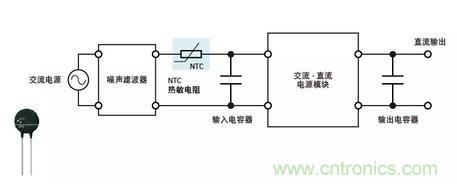 各種電源電路和外圍電路緊湊地集成到一起的內(nèi)置電源稱為電源模塊。交流-直流電源模塊是由交流-直流整流電路、直流-直流轉(zhuǎn)換器以及少量外部零部件組成的電源,可以形成一個(gè)節(jié)省空間的優(yōu)化電源系統(tǒng)。插入一個(gè)NTC熱敏電阻(電源熱敏電阻)可以有效地限制在通電時(shí)施加到輸入和輸出電容器上勵(lì)磁涌流。