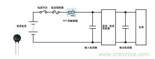 在直流-直流轉(zhuǎn)換器等的直流電源電路等中,NTC熱敏電阻用作電源熱敏電阻,有效地限制勵(lì)磁涌流,輸入和輸出電容器在接通電源時(shí)充電。NTC熱敏電阻的電阻在通電后變得非常低,達(dá)到比使用固定電阻時(shí)更低的功率損耗。