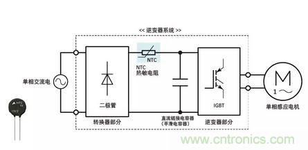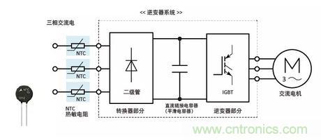 逆變器系統(tǒng)包括轉(zhuǎn)換器部分、逆變器部分和安裝在轉(zhuǎn)換器部分之后的直流鏈路電容器(平滑電容器)。啟動(dòng)時(shí),裝置充電,峰值比穩(wěn)定電流大幾倍的勵(lì)磁涌流充滿直流鏈路電容器。這種勵(lì)磁涌流可能對(duì)直流電容器的使用壽命產(chǎn)生有害影響或破壞半導(dǎo)體器件。為了防止勵(lì)磁涌流,所以連接NTC熱敏電阻(電源熱敏電阻)。