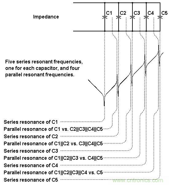 請記住,這五種電容每一個(gè)都不是單獨(dú)的電容器,而是一個(gè)串聯(lián)組合,包括電容器、電感器和電阻器??傊鼈冇纱?lián)的RLC電路構(gòu)成,將在串聯(lián)諧振頻率(SRF)處表現(xiàn)出串聯(lián)諧振,其中SRF=1/(2 × π ×√ (L × C))。對于如上所述并聯(lián)連接的五個(gè)電容的組合,將會有五個(gè)串聯(lián)諧振頻率,并且還會有四個(gè)并聯(lián)諧振頻率,如圖1所示。