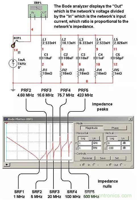 對于這5個(gè)電容,將有5個(gè)串聯(lián)自諧振頻率,即SRF1、SRF2、SRF3、SRF4和SRF5,其中每一個(gè)電容都在其自身的SRF處阻抗最小。但是,不可避免地,在頻率PRF2、PRF3、PRF4和PRF5處會產(chǎn)生4個(gè)總阻抗的并聯(lián)諧振峰值。