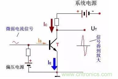 微弱變化的電信號(hào)通過三極管放大成波幅度很大的電信號(hào),如下圖所示: