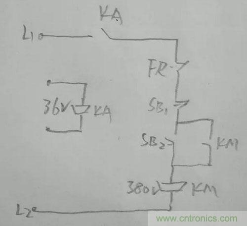 下面我畫了一個(gè)簡單的36v電源控制線圈電源為380v的接觸器的控制線路,供大家參考,也請(qǐng)大家多多指教。