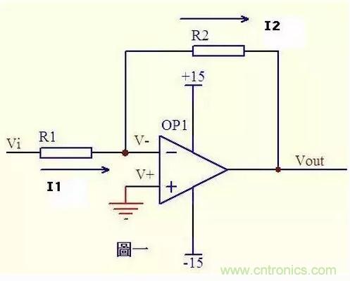 圖一運(yùn)放的同向端接地=0V,反向端和同向端虛短,所以也是0V,反向輸入端輸入電阻很高,虛斷,幾乎沒有電流注入和流出,那么R1和R2相當(dāng)于是串聯(lián)的,流過一個(gè)串聯(lián)電路中的每一只組件的電流是相同的,即流過R1的電流和流過R2的電流是相同的。 流過R1的電流I1 = (Vi - V-)/R1 ……a 流過R2的電流I2 = (V- - Vout)/R2 ……b V- = V+ = 0 ……c I1 = I2 ……d 求解上面的初中代數(shù)方程得Vout = (-R2/R1)*Vi 這就是傳說中的反向放大器的輸入輸出關(guān)系式了。