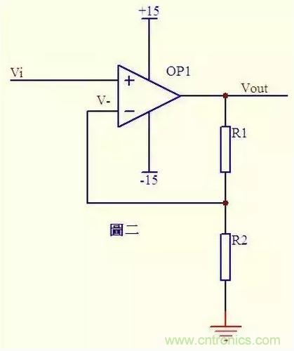 圖二中Vi與V-虛短,則 Vi = V- ……a 因?yàn)樘摂?,反向輸入端沒有電流輸入輸出,通過R1和R2 的電流相等,設(shè)此電流為I,由歐姆定律得: I = Vout/(R1+R2) ……b Vi等于R2上的分壓, 即:Vi = I*R2 ……c 由abc式得Vout=Vi*(R1+R2)/R2 這就是傳說中的同向放大器的公式了。