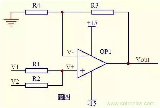 請(qǐng)看圖四。因?yàn)樘摂啵\(yùn)放同向端沒有電流流過,則流過R1和R2的電流相等,同理流過R4和R3的電流也相等。故 (V1 – V+)/R1 = (V+ - V2)/R2 ……a (Vout – V-)/R3 = V-/R4 ……b 由虛短知: V+ = V- ……c 如果R1=R2,R3=R4,則由以上式子可以推導(dǎo)出 V+ = (V1 + V2)/2 V- = Vout/2 故 Vout = V1 + V2 也是一個(gè)加法器。