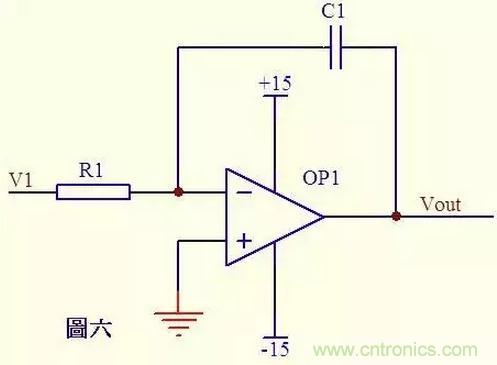 圖六電路中,由虛短知,反向輸入端的電壓與同向端相等,由虛斷知,通過R1的電流與通過C1的電流相等。 通過R1的電流 i=V1/R1 通過C1的電流i=C*dUc/dt=-C*dVout/dt 所以 Vout=((-1/(R1*C1))∫V1dt 輸出電壓與輸入電壓對(duì)時(shí)間的積分成正比,這就是傳說中的積分電路了。 若V1為恒定電壓U,則上式變換為Vout = -U*t/(R1*C1) t 是時(shí)間,則Vout輸出電壓是一條從0至負(fù)電源電壓按時(shí)間變化的直線。