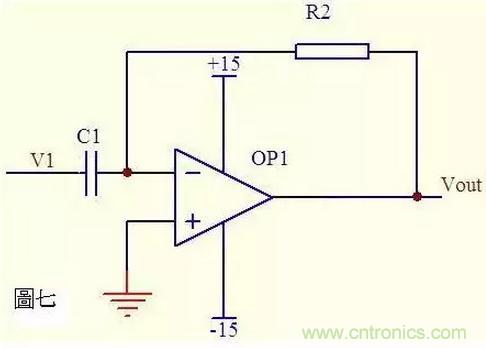 圖七中由虛斷知,通過電容C1和電阻R2的電流是相等的,由虛短知,運(yùn)放同向端與反向端電壓是相等的。則: Vout = -i * R2 = -(R2*C1)dV1/dt 這是一個(gè)微分電路。如果V1是一個(gè)突然加入的直流電壓,則輸出Vout對(duì)應(yīng)一個(gè)方向與V1相反的脈沖。