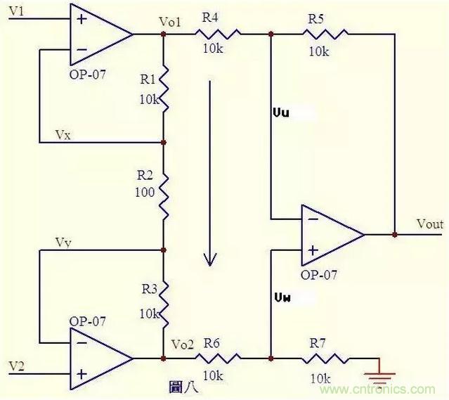 圖八.由虛短知 Vx = V1 ……a Vy = V2 ……b 由虛斷知,運(yùn)放輸入端沒有電流流過,則R1、R2、R3可視為串聯(lián),通過每一個(gè)電阻的電流是相同的, 電流I=(Vx-Vy)/R2 ……c 則: Vo1-Vo2=I*(R1+R2+R3) = (Vx-Vy)(R1+R2+R3)/R2 ……d 由虛斷知,流過R6與流過R7的電流相等,若R6=R7, 則Vw = Vo2/2 ……e 同理若R4=R5,則Vout – Vu = Vu – Vo1,故Vu = (Vout+Vo1)/2 ……f 由虛短知,Vu = Vw ……g 由efg得 Vout = Vo2 – Vo1 ……h 由dh得 Vout = (Vy –Vx)(R1+R2+R3)/R2 上式中(R1+R2+R3)/R2是定值,此值確定了差值(Vy –Vx)的放大倍數(shù)。 這個(gè)電路就是傳說中的差分放大電路了。