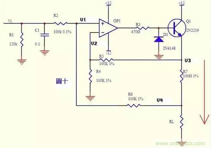 電流可以轉(zhuǎn)換成電壓,電壓也可以轉(zhuǎn)換成電流。圖十就是這樣一個(gè)電路。上圖的負(fù)反饋沒有通過電阻直接反饋,而是串聯(lián)了三極管Q1的發(fā)射結(jié),大家可不要以為是一個(gè)比較器就是了。只要是放大電路,虛短虛斷的規(guī)律仍然是符合的!