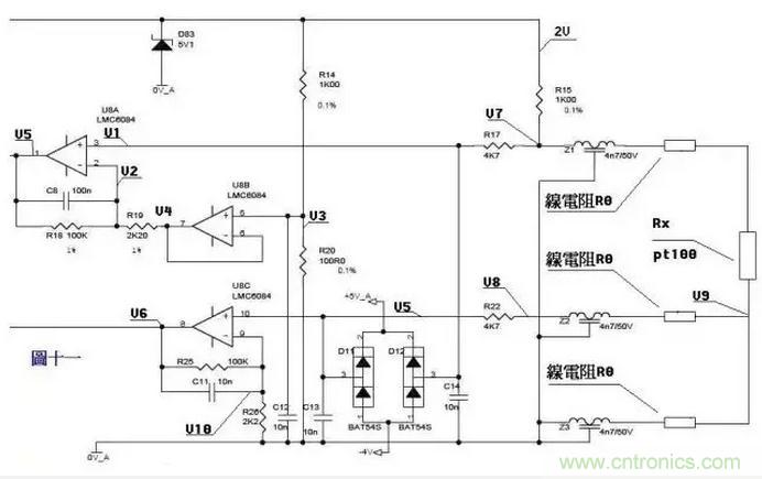 來一個(gè)復(fù)雜的,圖十一是一個(gè)三線制PT100前置放大電路。PT100傳感器引出三根材質(zhì)、線徑、長度完全相同的線,接法如圖所示。有2V的電壓加在由R14、R20、R15、Z1、PT100及其線電阻組成的橋電路上。Z1、Z2、Z3、D11、D12、D83及各電容在電路中起濾波和保護(hù)作用,靜態(tài)分析時(shí)可不予理會(huì),Z1、Z2、Z3可視為短路,D11、D12、D83及各電容可視為開路。 由電阻分壓知, V3=2*R20/(R14+20)=200/1100=2/11 ……a 由虛短知,U8B第6、7腳 電壓和第5腳電壓相等 V4=V3 ……b 由虛斷知,U8A第2腳沒有電流流過,則流過R18和R19上的電流相等。 (V2-V4)/R19=(V5-V2)/R18 ……c 由虛斷知,U8A第3腳沒有電流流過, V1=V7 ……d 在橋電路中R15和Z1、PT100及線電阻串聯(lián),PT100與線電阻串聯(lián)分得的電壓通過電阻R17加至U8A的第3腳, V7=2*(Rx+2R0)/(R15+Rx+2R0) …..e 由虛短知,U8A第3腳和第2腳電壓相等, V1=V2 ……f 由abcdef得, (V5-V7)/100=(V7-V3)/2.2 化簡(jiǎn)得 V5=(102.2*V7-100V3)/2.2 即 V5=204.4(Rx+2R0)/(1000+Rx+2R0) – 200/11 ……g 上式輸出電壓V5是Rx的函數(shù) 我們?cè)倏淳€電阻的影響。Pt100最下端線電阻上產(chǎn)生的電壓降經(jīng)過中間的線電阻、Z2、R22,加至U8C的第10腳,由虛斷知, V5=V8=V9=2*R0/(R15+Rx+2R0) ……a (V6-V10)/R25=V10/R26 ……b 由虛短知, V10=V5 ……c 由式abc得 V6=(102.2/2.2)V5=204.4R0/[2.2(1000+Rx+2R0)] ……h 由式gh組成的方程組知,如果測(cè)出V5、V6的值,就可算出Rx及R0,知道Rx,查pt100分度表就知道溫度的大小了。