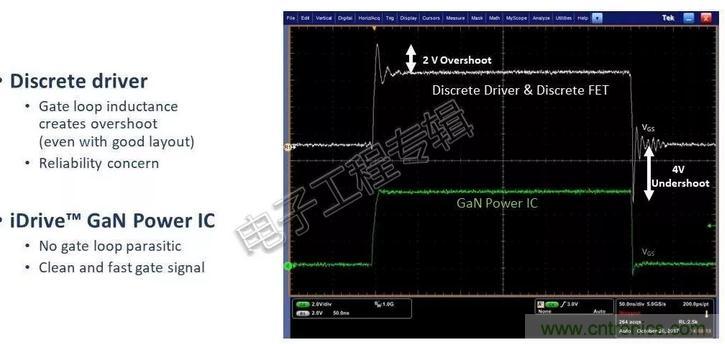 沒有柵極阻抗或電阻的分立解決方案會產(chǎn)生不穩(wěn)定的電路。 如果添加了阻抗,它會變得穩(wěn)定,但也會導(dǎo)致很長的開關(guān)周期。 因此,如果可以直接連接驅(qū)動器輸出和柵極輸入,那么就可以快速運行并保持穩(wěn)定。壓擺率只需要一個電阻即可搞定。 因此,集成意味著一種非??煽氐母咝阅芷骷?。