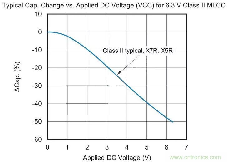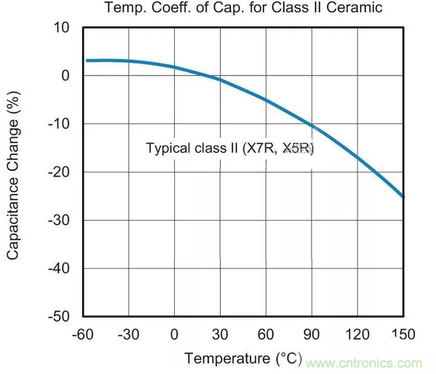 用于替換最可能的MLCC候選者采用“II類”電介質(zhì)材料。這種II類陶瓷(通常為X7R或X5R)的容值會在溫度范圍內(nèi)變化,這種特征稱為電容溫度系數(shù)(TCC),參見圖1。
