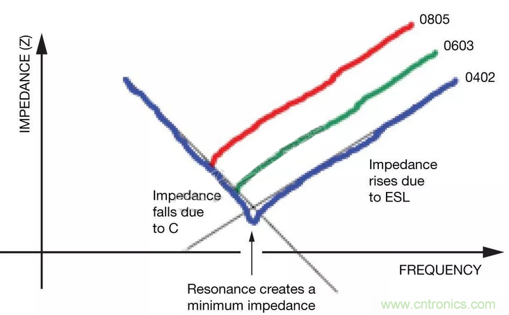 高速電路是一個(gè)例外,其中的感應(yīng)負(fù)載可能會延遲傳送來自電容的所需電流,從而影響電路性能。阻抗(Z)的影響因外殼尺寸而有不同,如圖4所示。