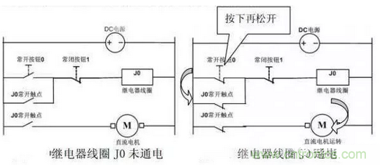 開(kāi)機(jī) = 按下常開(kāi)按鈕0 → 繼電器線(xiàn)圈J0得電 → J0常開(kāi)主觸點(diǎn)閉合 → 電機(jī)得電開(kāi)機(jī)、同時(shí)J0常開(kāi)輔助觸點(diǎn)自鎖 → 電機(jī)繼續(xù)運(yùn)行,如圖2-8。