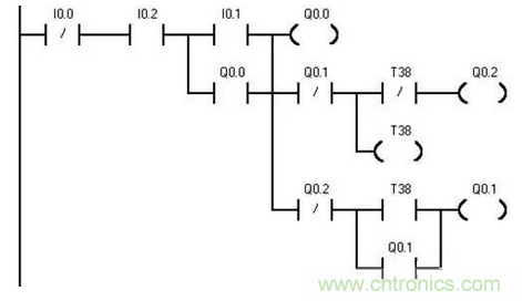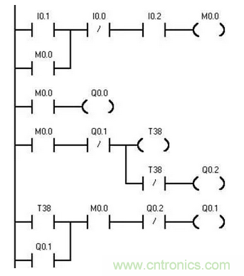 轉(zhuǎn)換后的梯形圖程序如圖2所示。按照梯形圖語(yǔ)言中的語(yǔ)法規(guī)定簡(jiǎn)化和修改梯形圖。為了簡(jiǎn)化電路,當(dāng)多個(gè)線(xiàn)圈都受某一串并聯(lián)電路控制時(shí),可在梯形圖中設(shè)置該電路控制的存儲(chǔ)器的位,如M0.0。簡(jiǎn)化后的程序如圖3-所示。