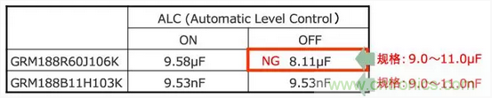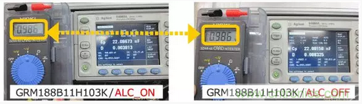 大容量和非大容量MLCC在ALC (Automatic Level Control )ON/OFF的狀態(tài)下測(cè)定靜電容量。結(jié)果如下。