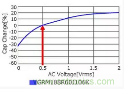 測(cè)定條件20℃、1KHz時(shí)的MLCC的AC電壓特性如下圖所示。