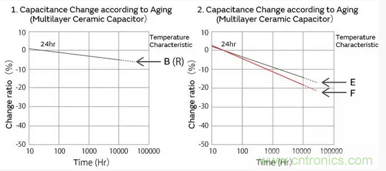 高誘電系的積層陶瓷電容器的靜電容量,以經(jīng)過(guò)125℃以上的熱處理24小時(shí)后的值作為基準(zhǔn),與時(shí)間成對(duì)數(shù)關(guān)系直線性下降。請(qǐng)參考如下本公司制品靜電容量老化特性的代表例子。