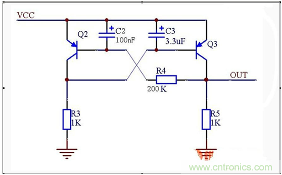 C2和c3很重要,在自鎖后,重啟電路就靠這兩個(gè)電容,否則啟動(dòng)失敗。原理是上電時(shí),電容兩端電壓不能突變,C2使得Q2基極在上電瞬間保持高電平,使得Q2不導(dǎo)通。C3則使得上電瞬間Q3基極保持低電平,使得Q3導(dǎo)通Vout有電壓。這樣R5位高電平,鎖住導(dǎo)通。