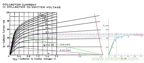 這里理解起來有些抽象,那我就具體的畫個(gè)圖,就很好理解了。在三極管截止的時(shí)候CE兩端的電壓是最大的,我們?cè)O(shè)為4.5V,在IB逐漸加大的過程中,VCE在逐漸變小,而飽和狀態(tài)下的Ic是由RC決定的,請(qǐng)看圖:
