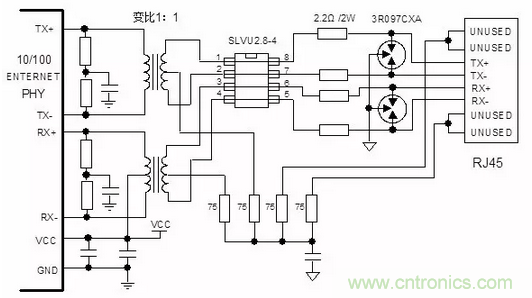 注意,TVS管的寄生電容可能影響信號完整性,可以使用壓敏電阻放在變壓器抽頭,作為防護電路,支持更高速率的網(wǎng)口設計。