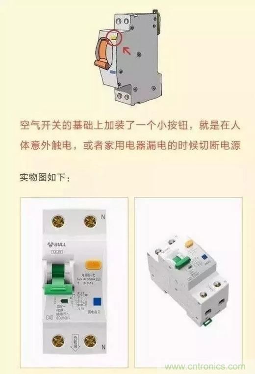 漏電斷路器是在空氣開關(guān)的基礎上添加的一個小按鈕,當發(fā)生意外漏電的時候,會引發(fā)開關(guān)自動切斷電源。