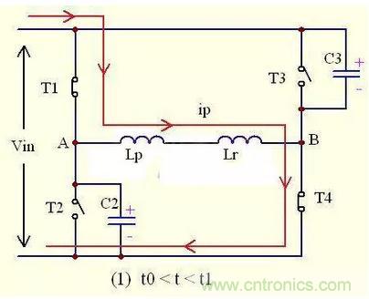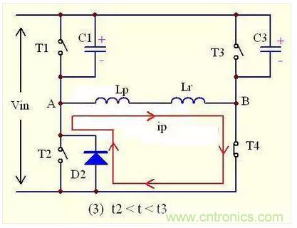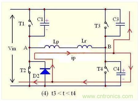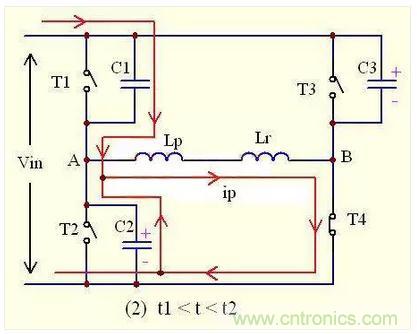 如上圖,此時T2與T3同時導通,T1與T4同時關(guān)斷,原邊電流ip的流向是T3—Lk—Lp—T2,如圖所示。